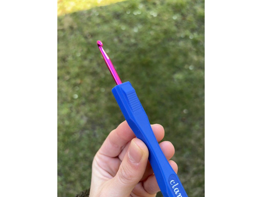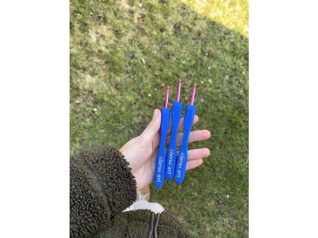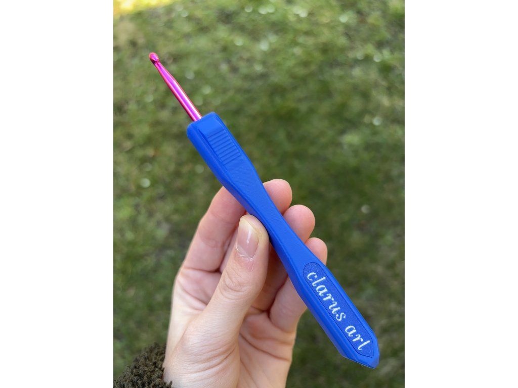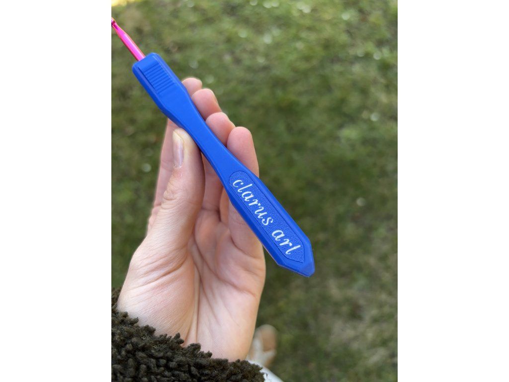 Růžový háček ve velikosti 4,5mm s modrou Clarusart rukojetí dělanou na 3D tiskárně.