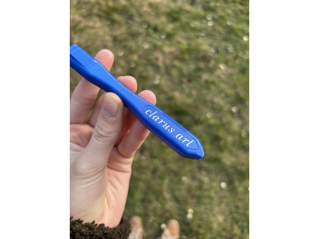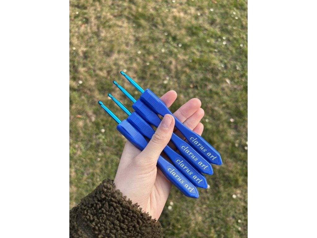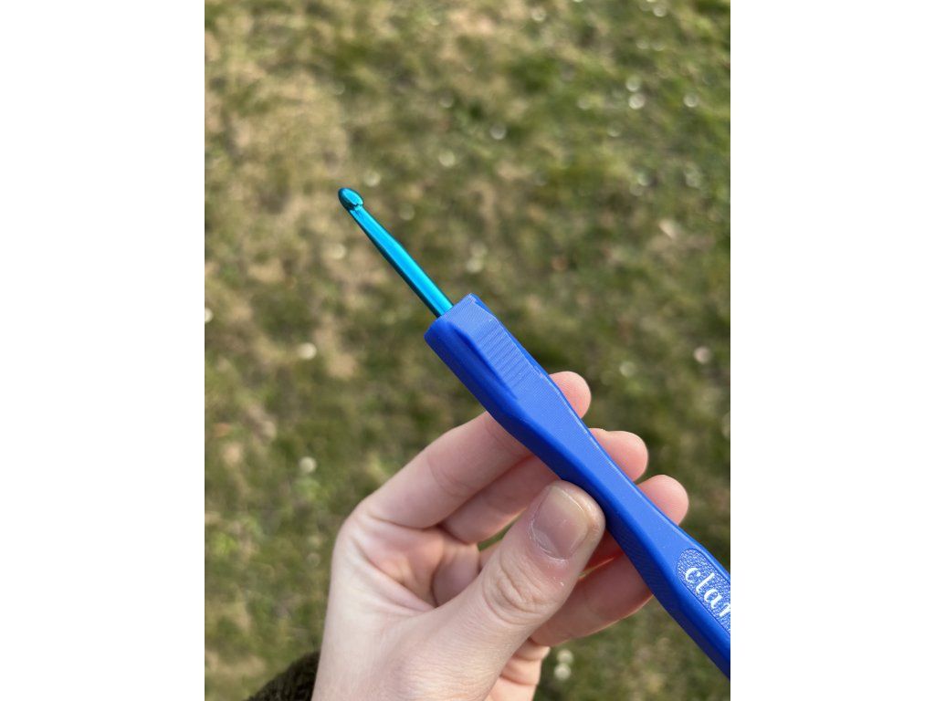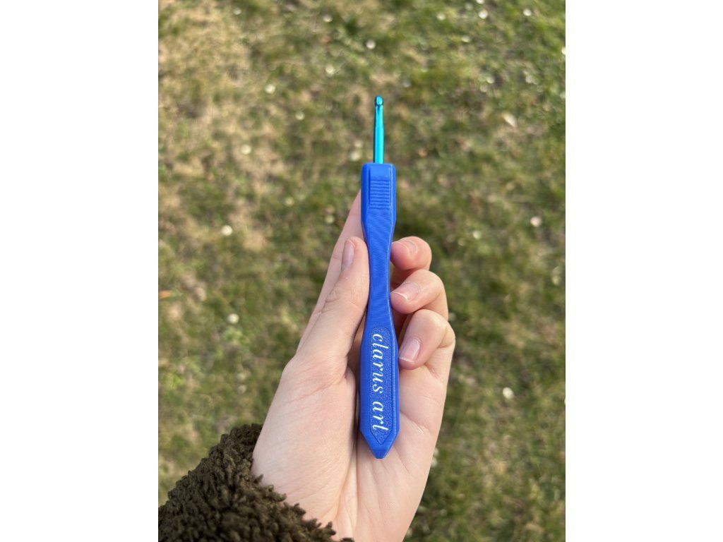 Modrý háček ve velikosti 5,0 mm s modrou Clarusart rukojetí dělanou na 3D tiskárně.